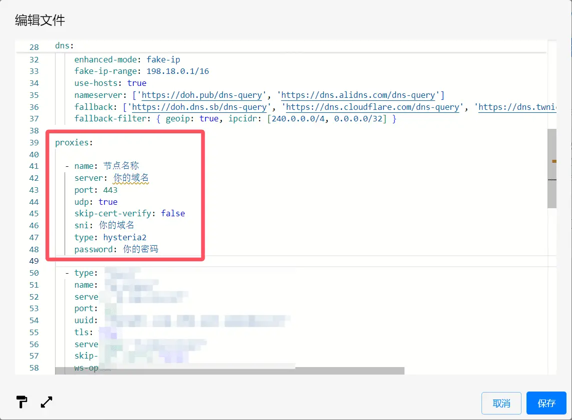 编辑你的订阅配置文件,在 proxies: 组添加服务器节点信息