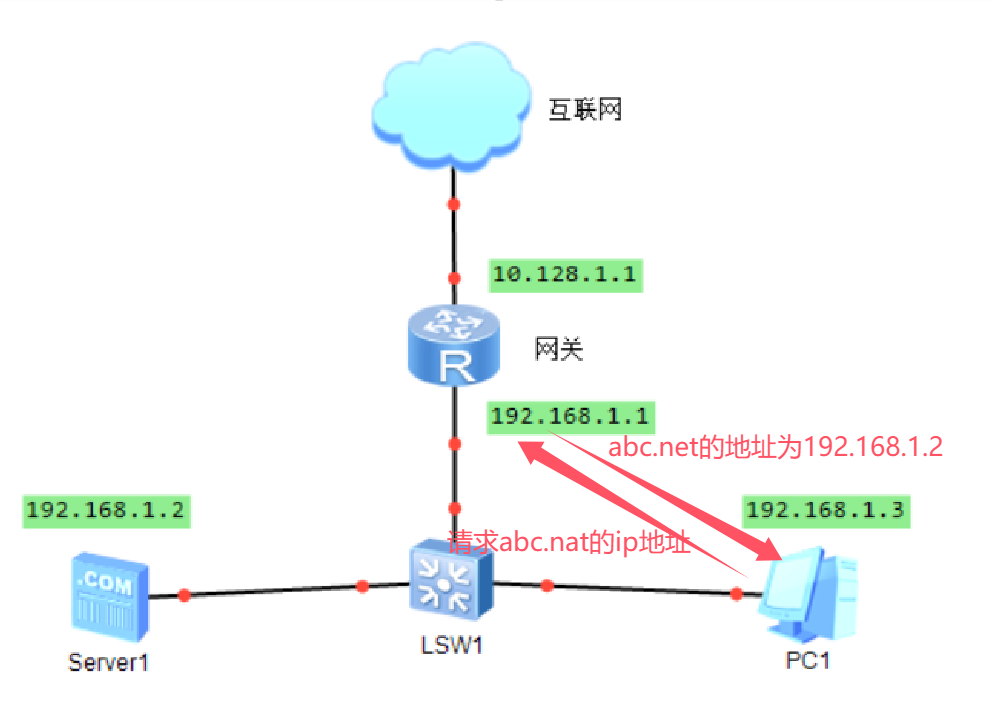 假如abc.net域名解析到10.128.1.1,内网设备PC1无法通过域名访问server1,遇到nat回环问题