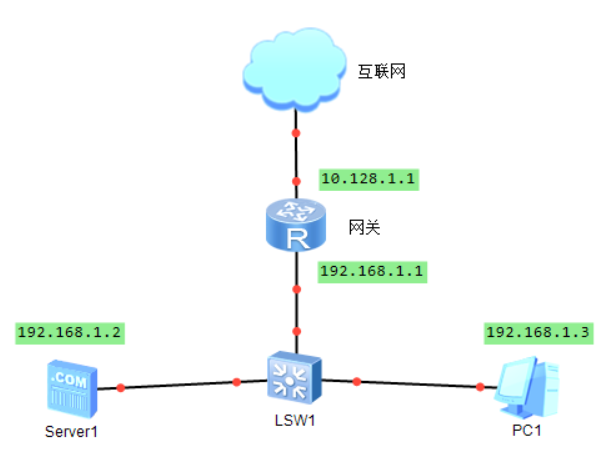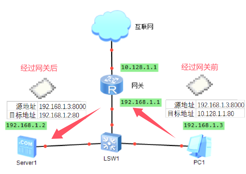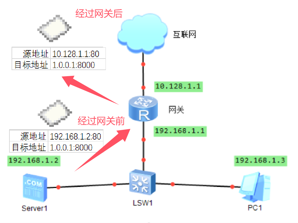 举个例子,存在一个192.168.1.0/24的内网(192.168.1.xxx),NAT网关为192.168.1.1,网关对外公网ip为100.128.1.1的网络。