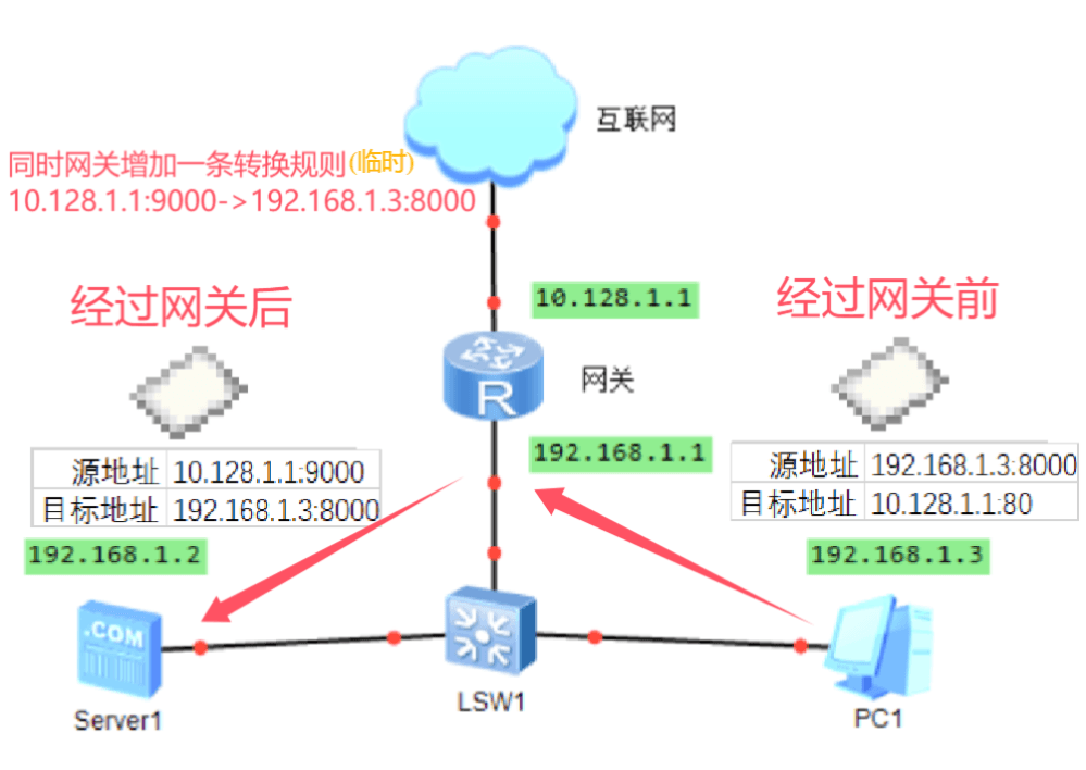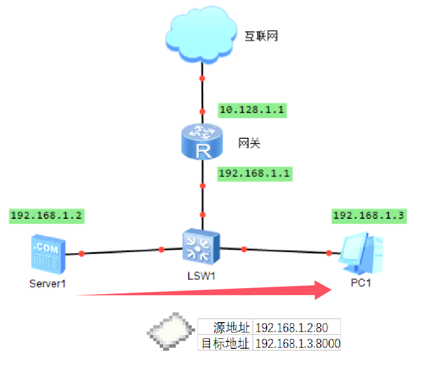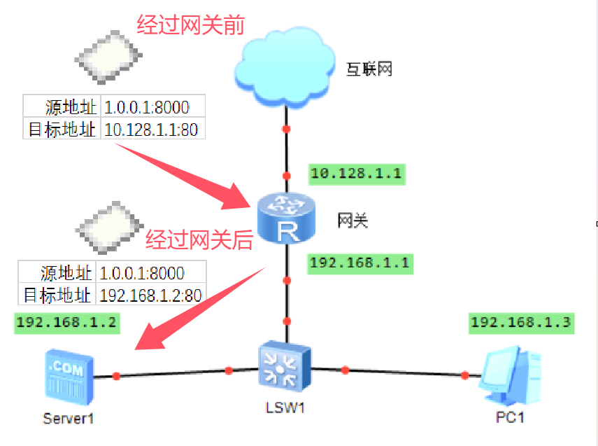 其中,192.168.1.2(server1)使用80端口对外开放了一个http服务,网关同时设定了端口映射规则10.128.1.1:80->192.168.1.2:80。这个规则意味着所有目标地址为10.128.1.1:80的数据包在经过网关时,目标地址会被网关替换成192.168.1.2:80,源地址不变。