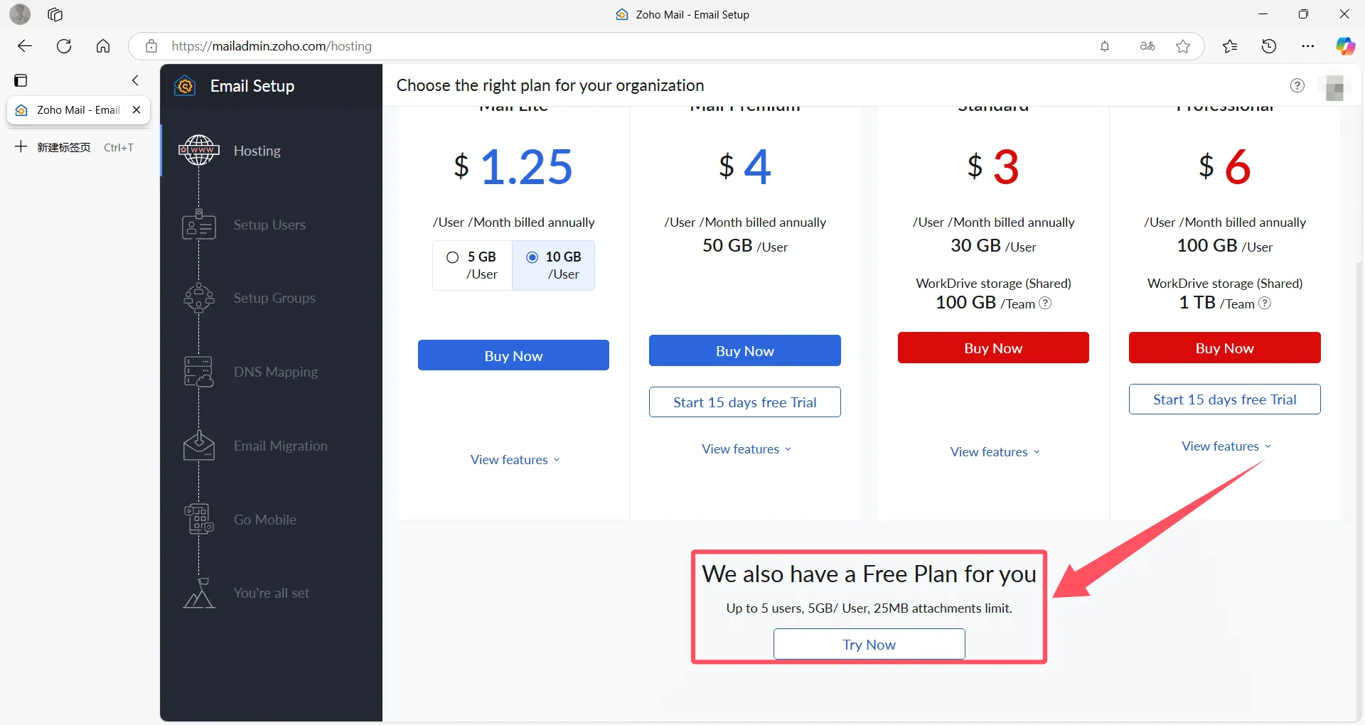 注意,弹出收费窗口时请选择免费计划,免费计划是国际版zoho,国内版没有,注意不要进错官网了。