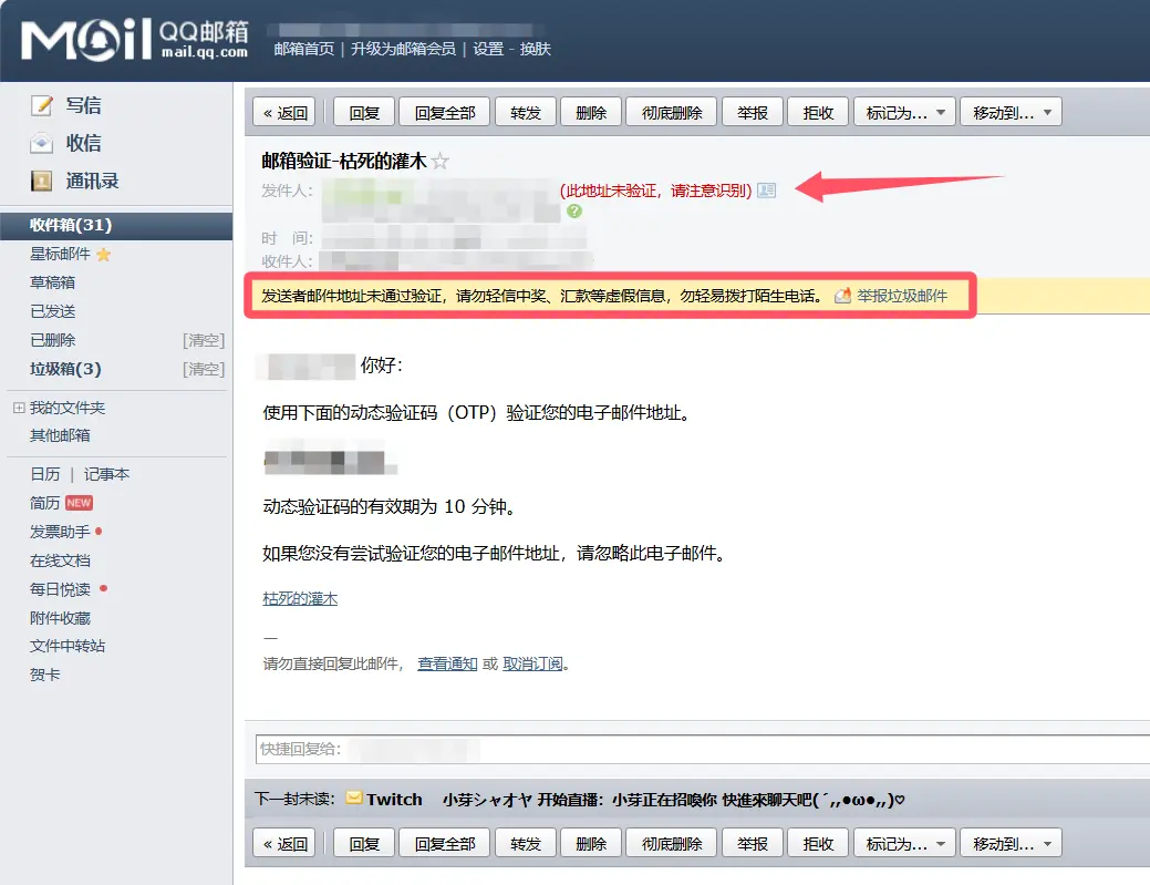 如果出现“(此地址未验证,请注意识别)”以及“发送者邮件地址未通过验证,请勿轻信中奖、汇款等虚假信息,勿轻易拨打陌生电话。 举报垃圾邮件”那就代表SPF记录和DKIM记录异常或者修改未同步(QQ邮箱会缓存SPF记录12小时)