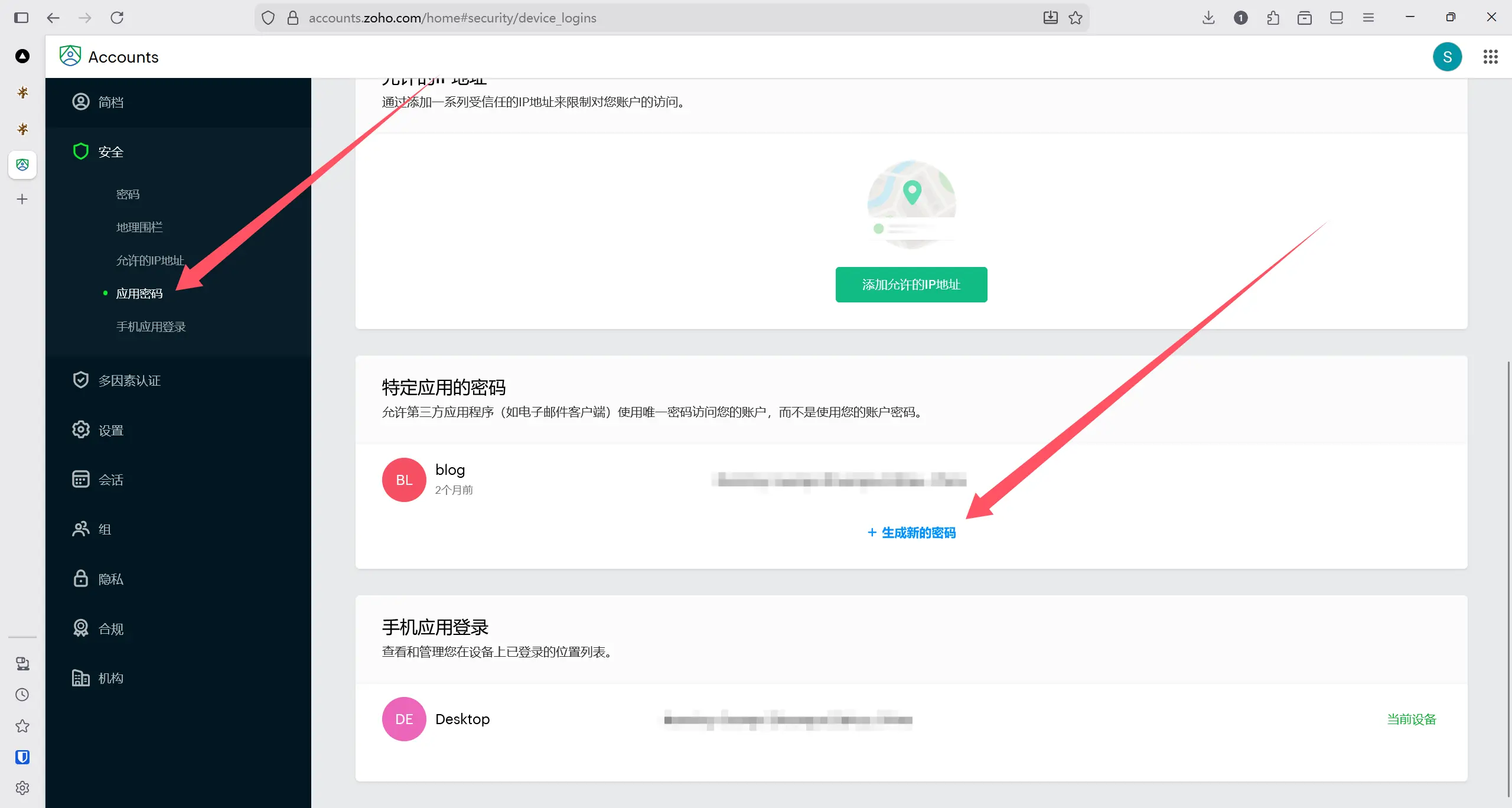 如果账号设置了2FA验证,则需要更进一步设置应用密码(zoho的smtp在账号设置了2FA验证的情况下不允许使用密码验证)